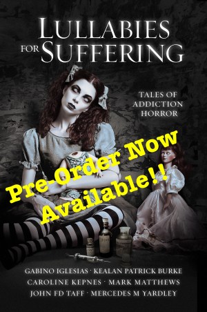 B: For an additional entry, send a screenshot of a Tweet, Facebook or Instagram post featuring this amazon link: Lullabies for Suffering – Tales of Addiction Horror with some variation of the phrase: “Come, listen to these Lullabies for Suffering” (or anything similar) (for a no-purchase necessary entry, simply email option B)